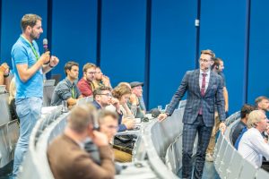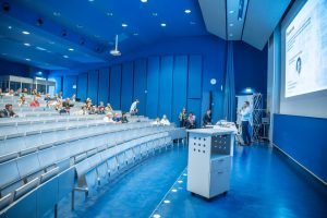 - Der große Hörsaal des Veranstaltungsgebäudes als zentraler Ort des Geschehens