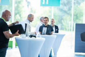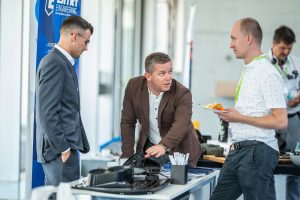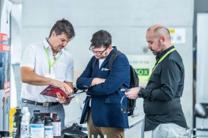 - Michal Amrich und Daniel Koleci (Entry Engineering, CZ) im Austausch mit Paweł Widomski (Technische Universität Wrocław, PL) am Messestand